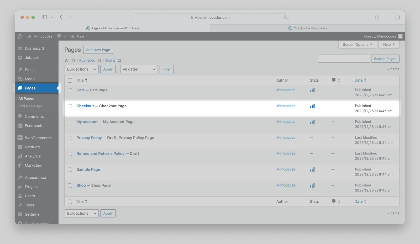 - Go to Pages section and click on Checkout.