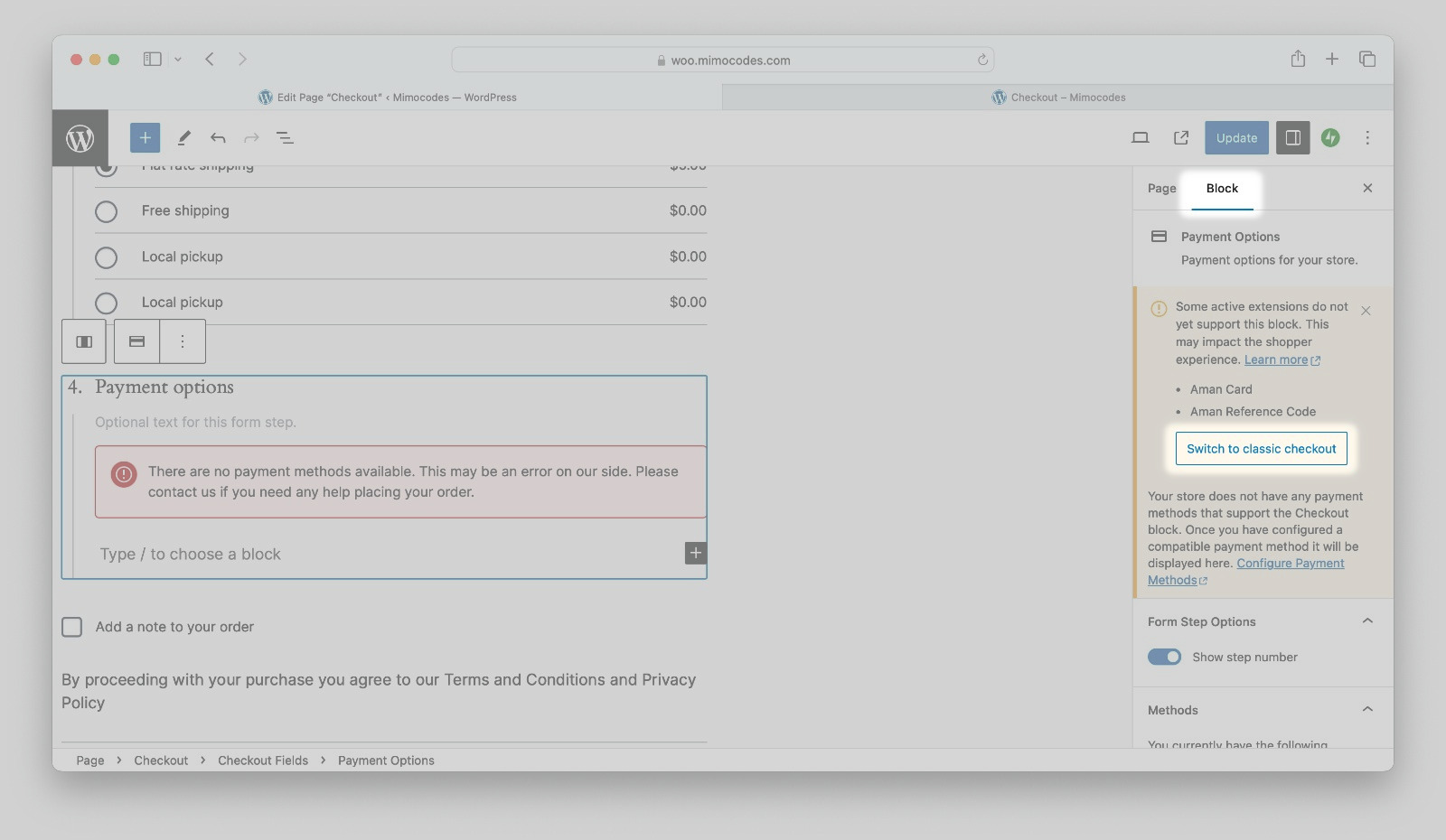 - From the Block tab Click on Switch to classic checkout.